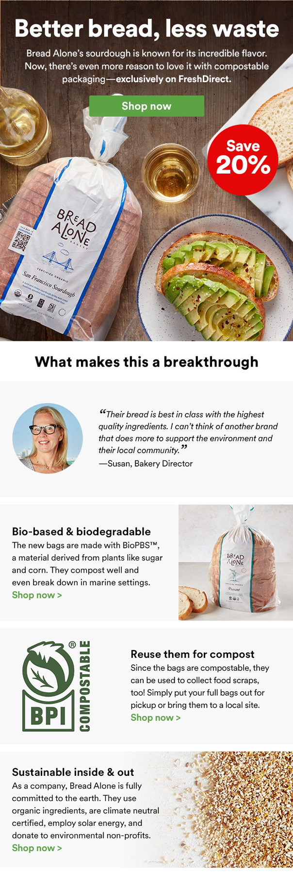 FreshDirect participates in a number of partnerships in which the creative must be mutually aligned with multiple brand styles and priorities. This email is one of many projects in which the messaging was refined to focus on how our’s partner’s values overlap with our own—here, how Bread Alone is a key player within our own commitment to environmental consciousness.