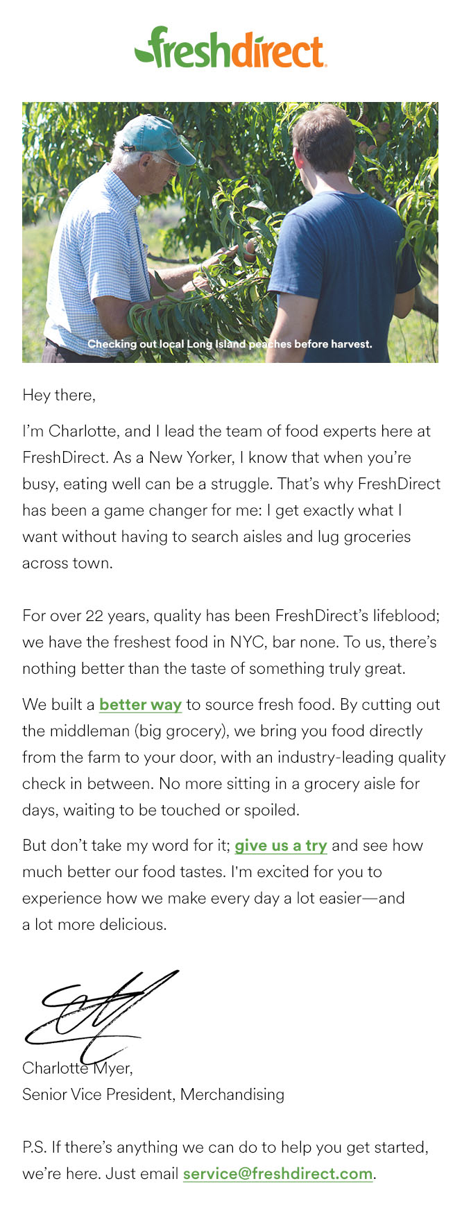 This letter is sent immediately upon registration and establishes the key differentiators and features that FreshDirect is known for. Incorporating a humanized and personal touch in this ghostwritten message from a team leader has driven positive sentiment among new customers.
